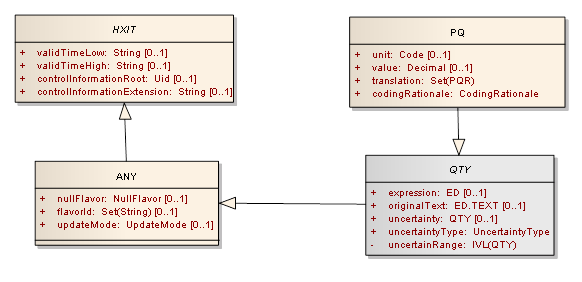 ISO 21090 had a base value proposition: that implementers can take the UML model or the schema, and implement them as is with no fancy shenanigans. So we had to make a choice - one of the three above. We chose option #3 for most of the mixins, and pushed their properties up to X, which in practice means that ANY has the HXIT properties, and QTY has the URG and EXPR properties. This, after all, mapped directly to the actual implementations that existed for the v3 data types at the start of the project (at least, those that people would own up to). Btw, it works too - my data type implementation is code generated from the UML (manually, by keyboard macros, but still generated). Other implementations are code generated from the UML or schema too.