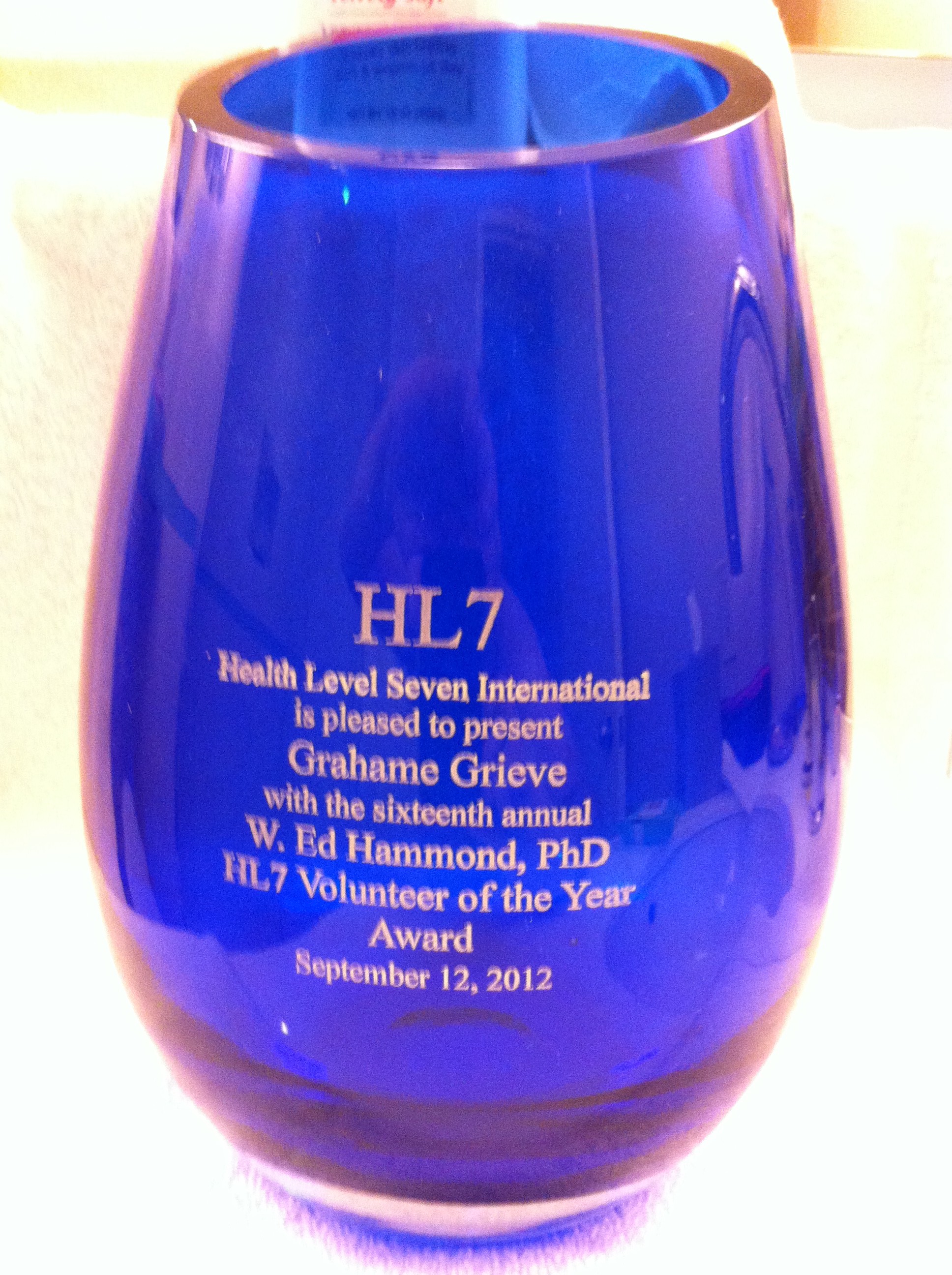 Sep 13, 2012It’s the annual HL7 Plenary workgroup meeting. This means that there’s a few little extra administrative-type events here, and one of those events is the presentation of the “Ed Hammond Volunteer of the year” award. This is a particularly prestigious award, made to only a very few people who have gone beyond the call of duty to push the cause of HL7 - that is, development of healthcare standards and interoperability. The recipient list is a small and select bunch. This year, there were two recipients: Keith Boone, and myself.