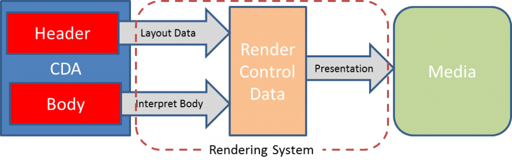 The portion between the CDA document and the media is called the “Rendering System”. Usually, the rendering system is based on web browser technology: the first step is called a “transform”, the render control data is html, and the presentation is a browser like Internet Explorer. However it is not necessary to use a browser based rendering system: all that is required is that however the document is presented, the user sees what the author intended.