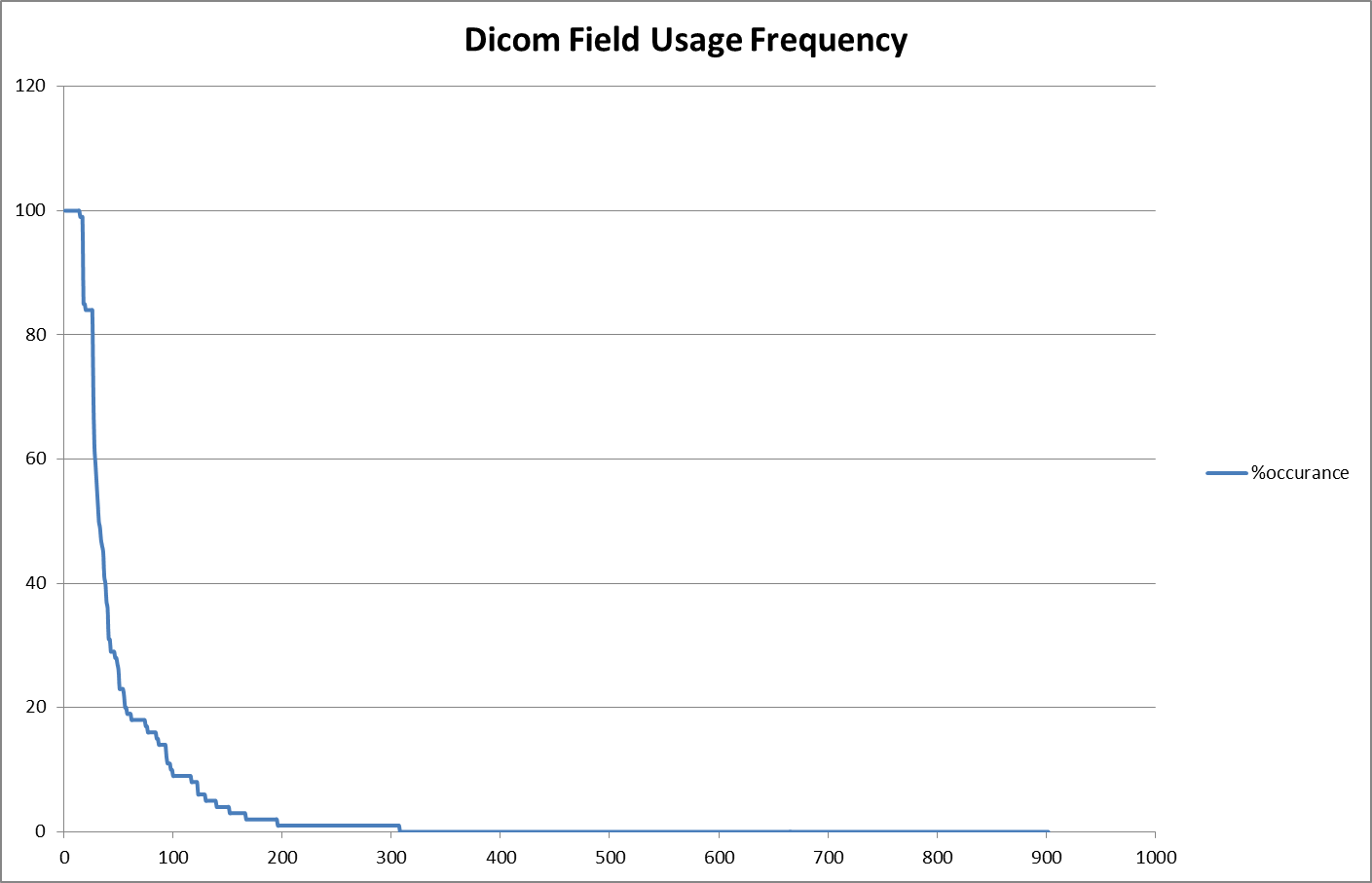 As part of my preparation for the HL7 Phoenix meeting, I’m giving some thought to what a FHIR resource for RESTful access to DICOM images would look like (this is possible future joint work with NEMA). It’s early days - we don’t know what the scope of RESTful resources would be - study, series, image, plane? But as part of my preparative work, I prepared a scatter plot for the frequency of DICOM elements in my set of sample DICOM images (mostly derived from http://support.dcmtk.org/wiki/dicom/images, but also stuff I’ve collected through commercial use in Australia). Note that it’s easier to collect this for DICOM than for HL7 v2 and CDA documents, since it’s easy to pack messages into files and vice versa (something that I’d like to be true of FHIR, because it really is good for the ecosystem). So we could take this sample set as somewhat illustrative of the situation in health care exchange generally (Note: I have only included data elements in the root of the file, not nested sequences, and the distribution includes manufacturer defined tags as well):