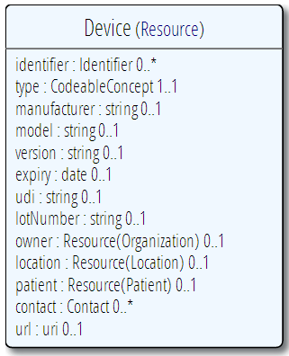So, at least in the context of FHIR, supporting UDI becomes clear. Anywhere a device is involved in the care process, the resource that describes the process should reference a device resource - which describes the resource. The device the resource has the following simple structure: