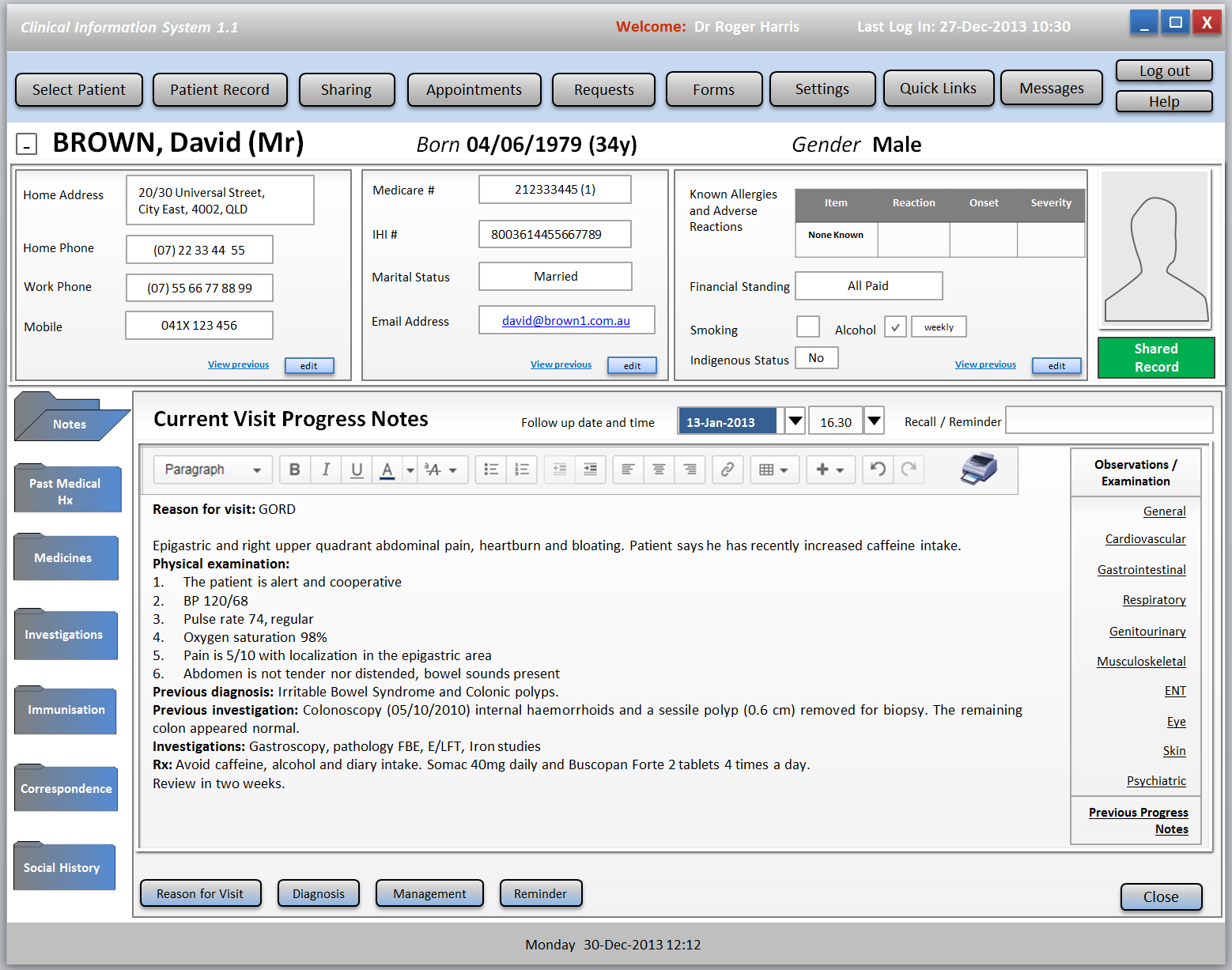 - The top banner: Name, DoB, Gender, the first two panels (address, phone, work, mobile) and (identifiers, marital status, email address), indigenous status (race, for non-Australians), and the image are all from the patient resource
