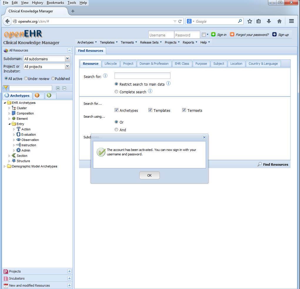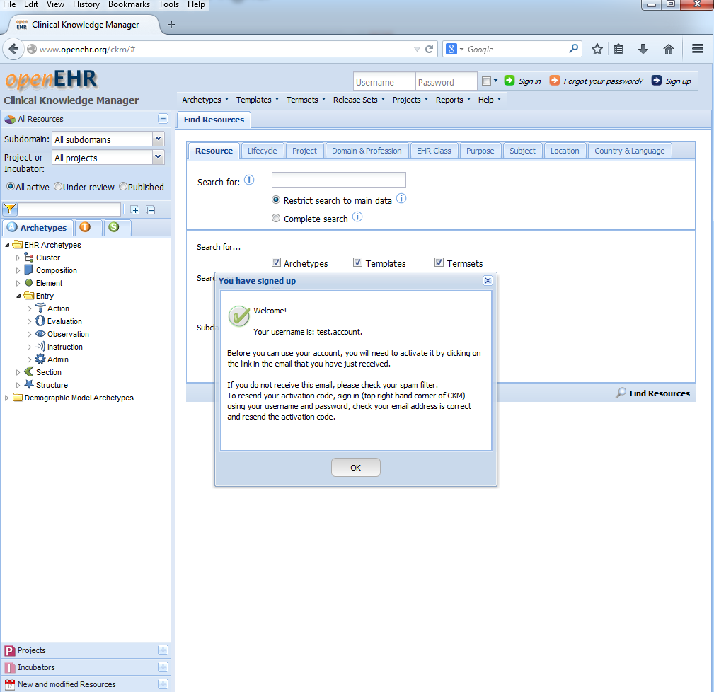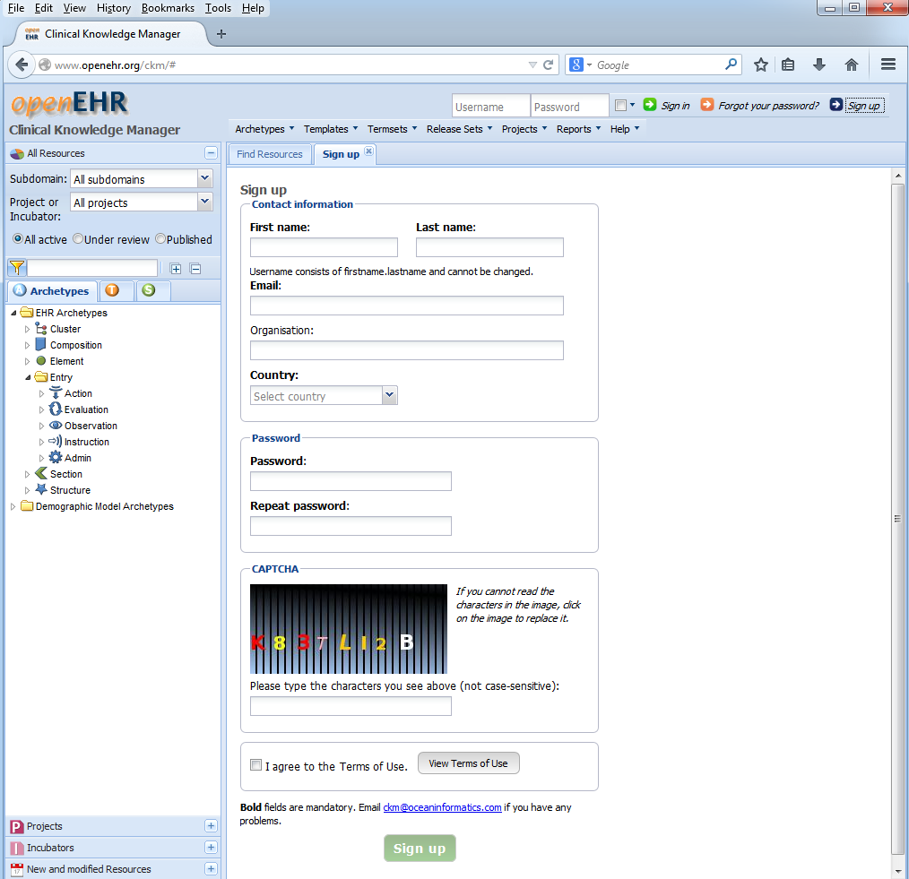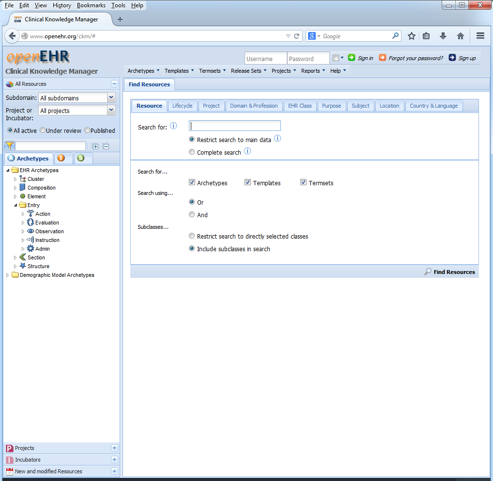 To sign up to participate in the review, Go to http://www.openehr.org/ckm/#. You’ll get this page: