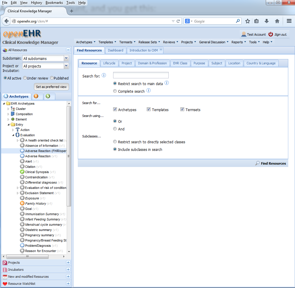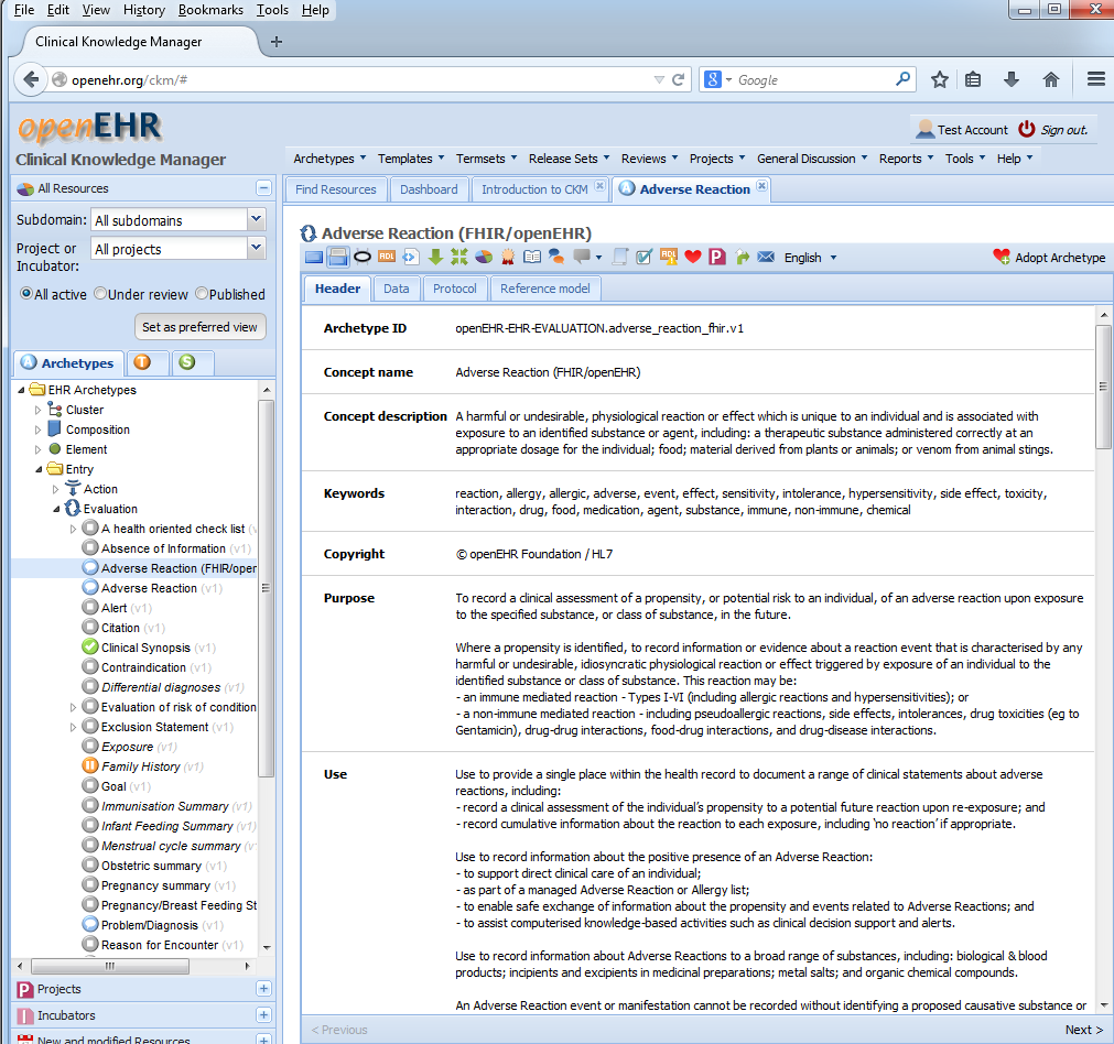 Now, sign in (top right), and then find the FHIR/OpenEHR adverse reaction: