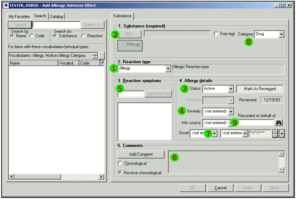 Nov 1, 2014I’ve just posted an updated Allergy/Intolerance resource for the candidate FHIR DSTU2. This is closely very based on the shared FHIR/openEHR achetype, though the resource has been renamed. As part of preparing it, a few of us surveyed existing systems, and it seems useful to post the details of these here. Here’s a variety of allergy/intolerance data entry screens from around the interwebs (only one betrays it’s original directly). Each of them is marked with a set of numbers that identify the fields in the Allergy/Intolerance resource: 1. .type