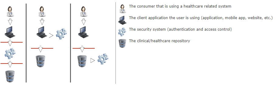 In order to make this work, the security appliance as to communicate the details of the request to the FHIR Server. The most obvious way to do this is to pass a jwt in the Authorization header in the request from the security appliance to the FHIR Server. The jwt needs to communicate at least a user identity – for which the natural choice is to use openId connect tokens, though additional details around roles, groups, and authorizations may be required.
